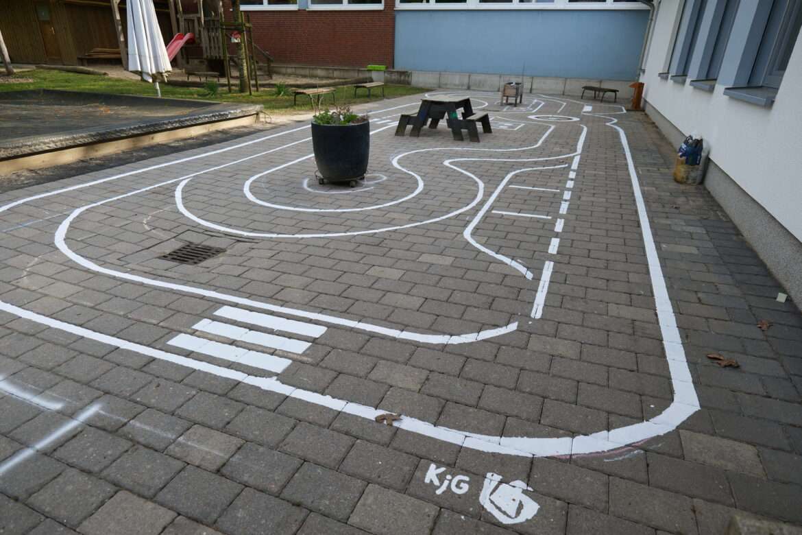 Unsere Aufgabe drehte sich rund um den Außenspielbereich der KiTa St. Josef. Hier haben wir eine Baumhütte aufgebaut und einen verschönerten Spielebereich geschaffen, ein Podest zum Sitzen im Innenhof aufgebaut und eine Fahrbahn für Bobby-Cars aufgemalt.